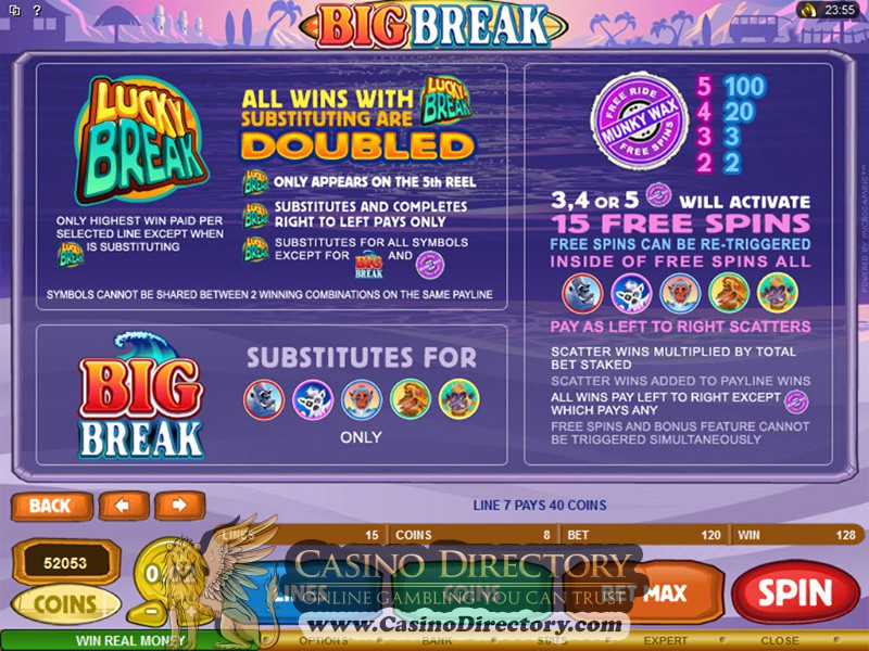 For a game that has been around for more than six years, Big Break excels in the extra features department, offering numerous opportunities to improve the line wins. Two Wild icons and Scatter Wins are there just for starters, but it is the Munky Wax Free Spins and Surf's Up Bonus that can really make a difference to your bankroll.