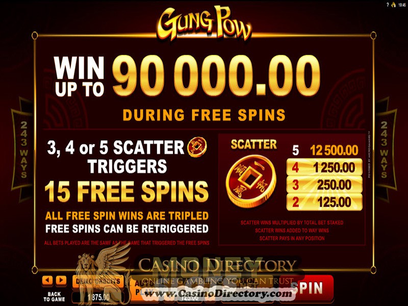 Gamers can further increase their total bet by staking up to 250 credits per spin, whilst coin value ranges from $0.01 to $1. Gung Pow Logo is Wild and while it only appears on reels 2 and 4, the symbol substitutes for all non-feature icons. Meanwhile, I Ching coin of good luck is Scatter and it awards entry into the Free Spins round.