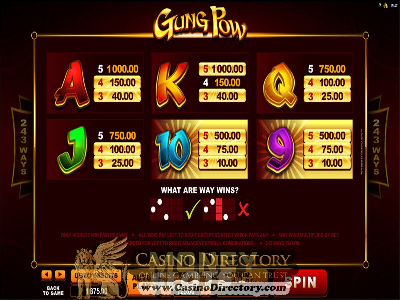 Gung Pow is played at 243 ways scheme, which has become a fixture in the latest Microgaming titles, and it definitely carries an extra value seeing as how players only need two or more identical symbols to appear anywhere on adjacent reels in order to receive a payout. And with minimum wager standing at 25 coins, this definitely beats playing at twenty five conventional paylines.